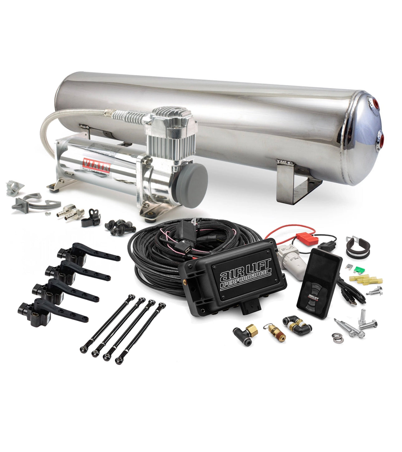 The 3H from Air Lift Performance is a pressure/height based management that features 5 user-programmable pressure presets and individual, four corner, air spring control. The 3H’s wired digital controller displays all four bag pressures as well as the tank pressure. The controller uses a full color, backlit screen and features a rotatable keypad that allows for horizontal controller mounting.